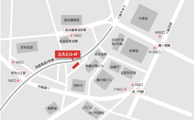 ・東京メトロ 日比谷線・丸ノ内線・千代田線「霞ヶ関駅」13番出口より徒歩7分